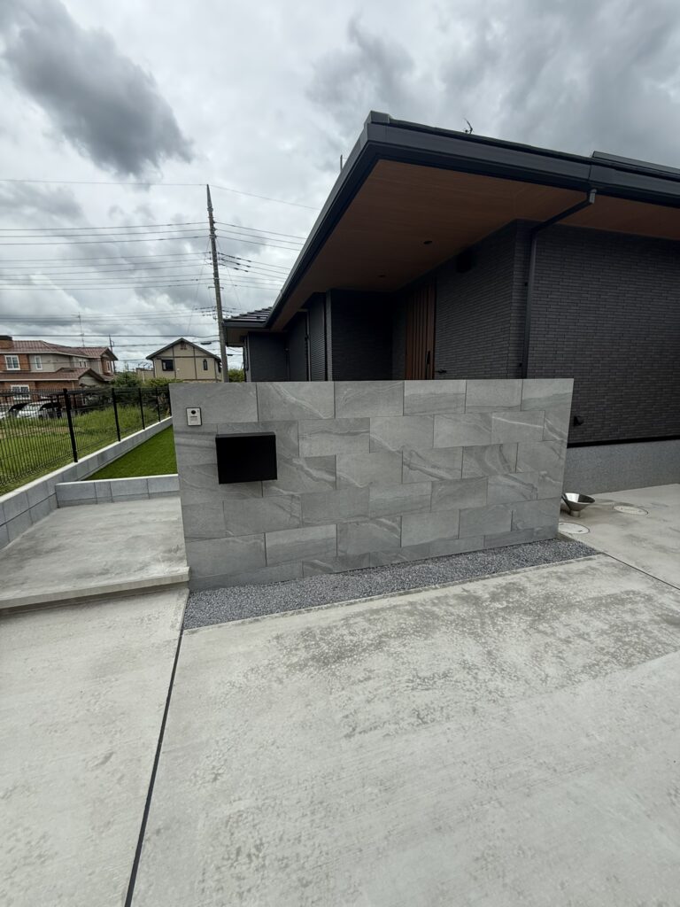 続いて造作門柱です!今回使用した商品は、弊社ではおなじみLIXILさんのアヴァンティになります!手前の砂利部分には割栗石を置いてライトを設置する予定です(^▽^)/この大迫力の門柱いかがでしょうか?門柱は外構の顔だと思っております。だからこそ大きく、カッコよくしたいポイントの一つになりますね🌸