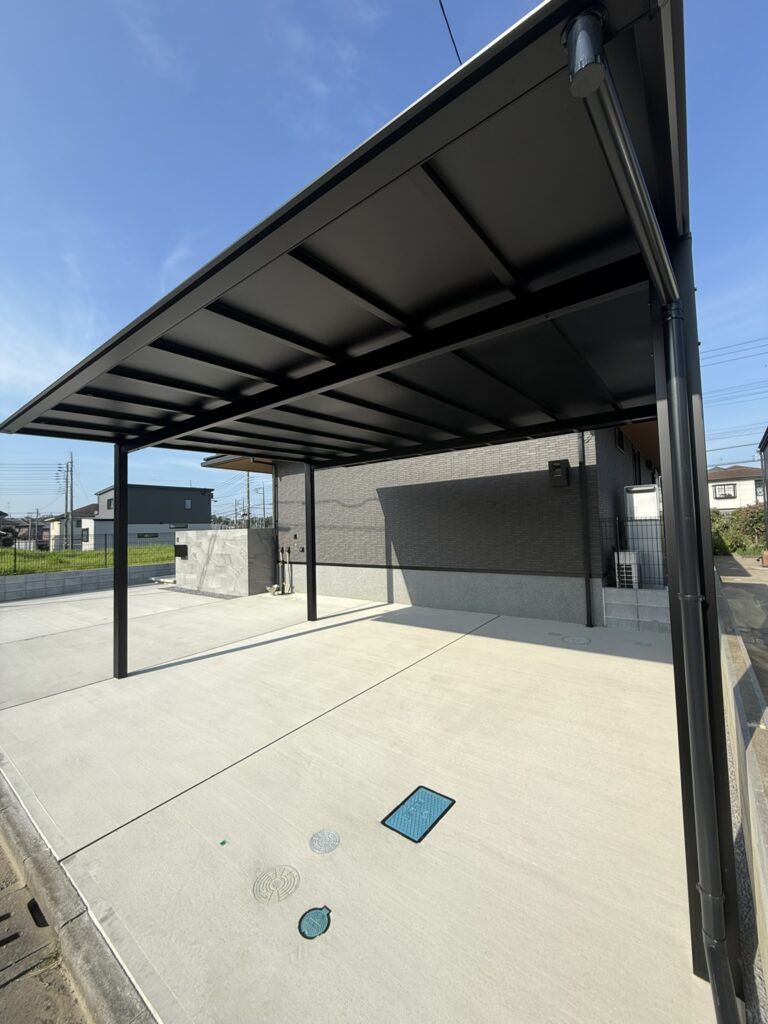 今回使用したカーポートは三協アルミさんの、スカイリードになります!その中でも屋根材に注目してみてください!一般的なカーポートの屋根材は、半透明なもので、光を通してしまう物でしたが新商品で光を通さない、マットブラックという商品が出されました!御覧の通り、光を一切通さない素材になっておりますので、屋根の汚れが見えなかったり、普通ポリカよりも熱線遮断ができる商品となっております🌸LIXILさんのカーポートSCだったり、三協アルミさんのビームスだったりと、カッコいいカーポートはやはり高価になってきます。その中でも比較的に価格を抑えつつ、ほかには無いカッコいいカーポートをお求めの方にはオススメ致します(⌒∇⌒)